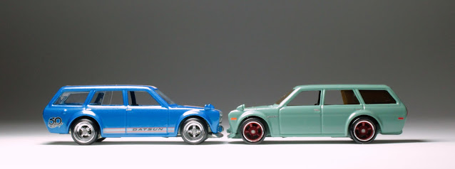 Quem diria que uma miniatura de carro japonês iria roubar a atenção dos colecionadores do maior mercado desse produto no mundo. A 510 Wagon foi apresentada em 2013 na Boulevard (confira aqui o post), o modelo é uma versão customizada do ex-design da marca Jun Imai, e rapidamente se tornou queridinha dos consumidores, tanto que nos últimos sete anos foi reproduzida dezoito vezes (sem contar a primeira). O modelo foi até escolhido para compor as unidades que fizeram parte de uma série dedicada aos 50 anos das Rodas Quentes em 2018, e como podem perceber esta bem feita com pintura nos faróis, grade e lanternas traseiras. Na Hot Wheels eu apresento a '71 Datsun Bluebird 510 Wagon da série Aniversário de 50 anos de 2018 com pintura azul e rodas RR4S cromadas.